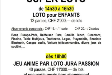 Le SHC Buix est ravi de vous inviter à son super loto le dimanche 1er mars à la Halle Polyvalente de Buix ! Loto des enfants : 14:30-16:30 – 12 parties – 2’000chf de lots ! Dès 18h00 : Super loto – 40 passes – 11’000chf de lots (hors royale) Lire la suite